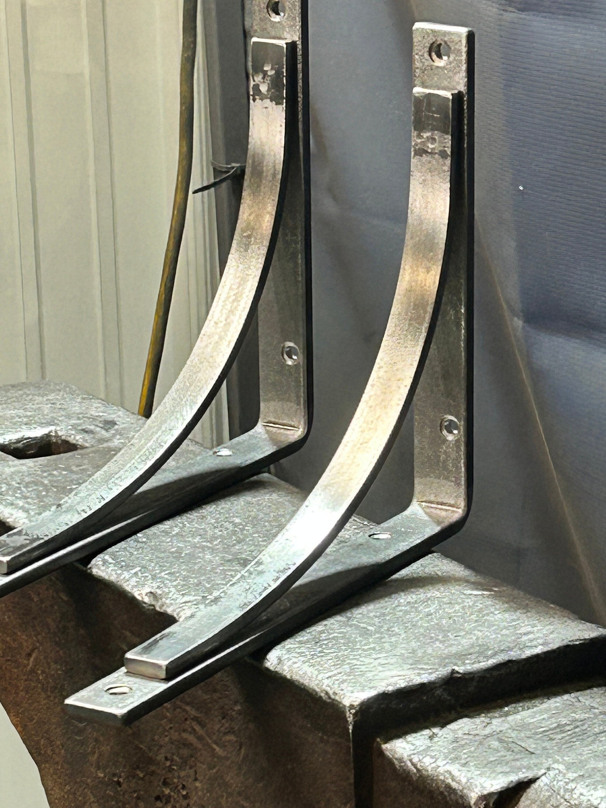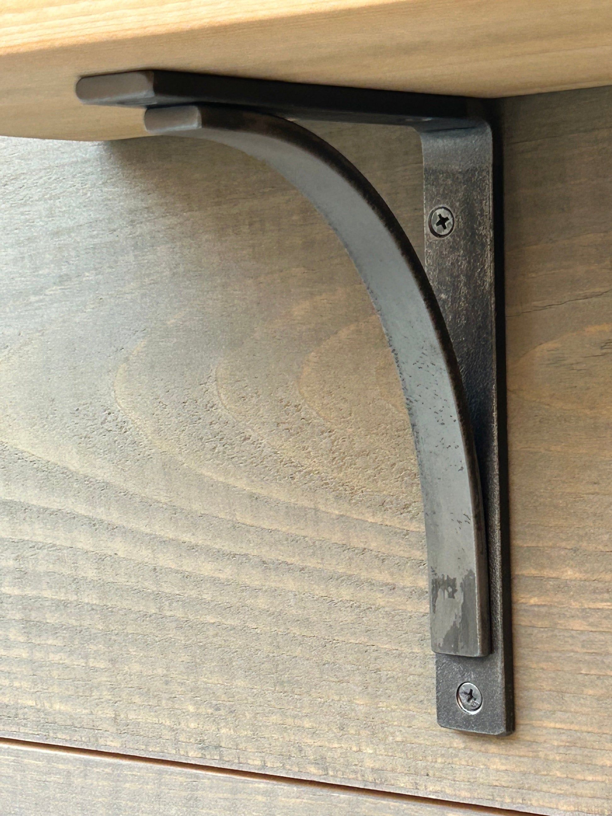 The Adirondack bracket adds a super strong and stylish, minimalist, industrial touch to any decor! This design is a simple and true blacksmith-made bracket. Great for kitchen open shelving, as counter or bar top corbel or enhancing your existing furniture. Use them under cabinets or to add support to table legs, or to accentuate practically any other right-angle in your home! It is amazing what forged steel brackets can do to beautify and strengthen pre-existing furniture, cabinetry, door casings and architectural elements, or use them in your next shelving design idea.