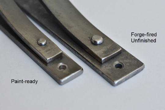 Forged Unfinished: Provides no barrier to rust or moisture, but allows you to paint or finish your brackets however you desire. Rust may form over time, depending on the level of moisture your brackets are exposed to. Finish them yourself, the way you want! Forged items have a mildly tortured and rustic appearance and texture as a result of being heated to over 1200 degrees Fahrenheit. The texture/appearance is unpredictable with random and unique markings that occur naturally within the process. Forge-fired items are fully heated, wire-brushed and finished with your choice of finish.